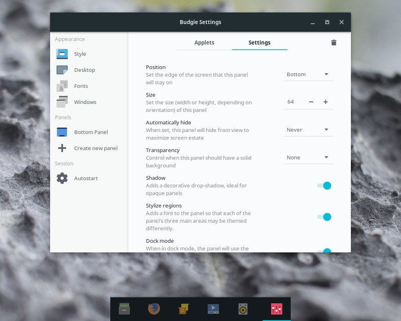 Tutte le impostazioni sono configurabili mediante l’applicazione Budgie settings: potete aggiungere più pannelli o modificarne la trasparenza e tanto altro ancora.