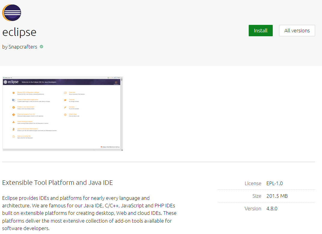 Ogni applicazione ha una pagina dedicata con una descrizione e dettagli vari oltre a una serie di screenshots. Ogni app offre diversi metodi per l’installazione. Alcune informazioni accessorie sarebbero utili: ad esempio la data dell’ultimo aggiornamento o il link al sito degli sviluppatori.