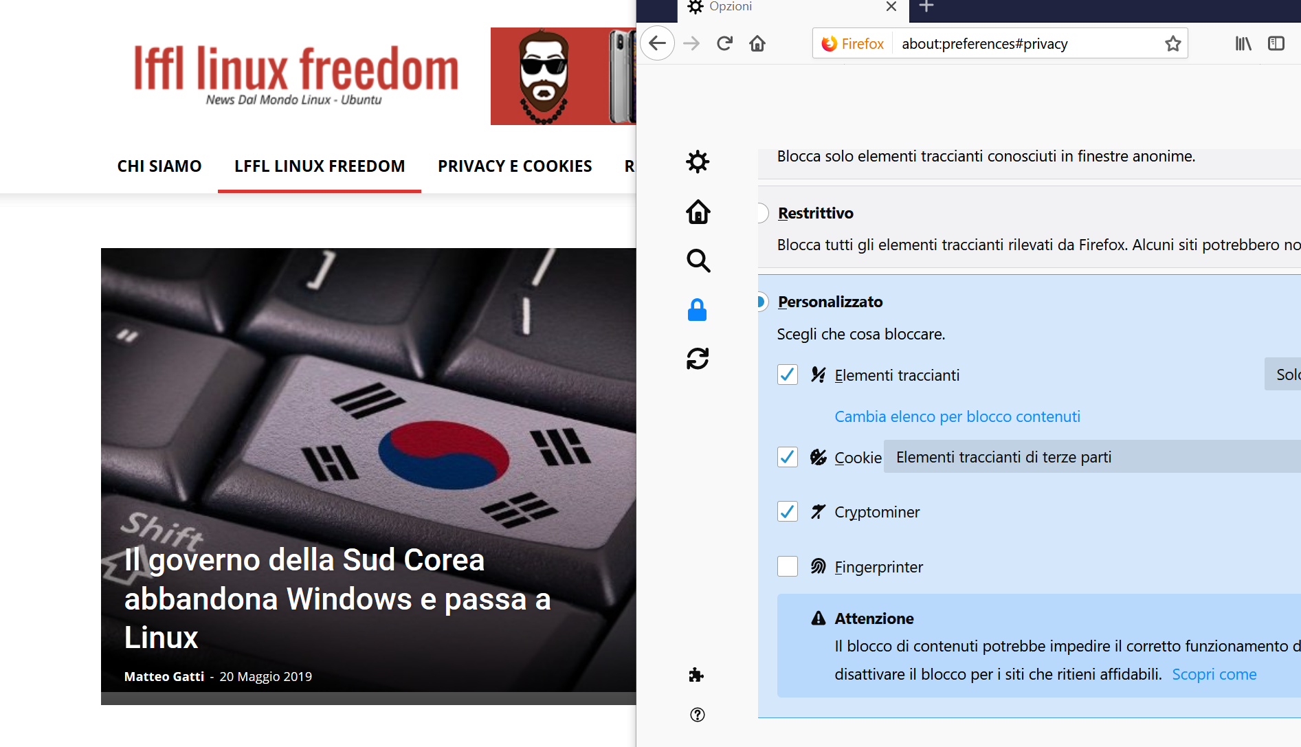 Digitando about:preferences#privacy nella barra degli indirizzi, cliccando su Personalizzato quindi spuntando la casella Cryptominer si potrà attivare la nuova difesa.