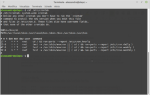 I primi cinque campi indicano la periodicità temporale,infine l’ultimo indica l’azione vera e propria. Ad esempio in questo pc possiamo notare che c’è un job che viene eseguito quotidianamente alle 6:25 e uno da eseguire a cadenza settimanale alle 6:47. Le istruzioni sono contenute in /etc/cron.daily, /etc/cron.weekly e /etc/cron.mothly, ove presenti. Ricordiamo che solo l’amministratore di sistema ha i privilegi per modificare crontab. Gli utenti possono creare il proprio scheduler dando il comando crontab -e, che al primo avvio chiederà anche quale editor utilizzare tra nano, vi o emacs. In questo caso i file verranno salvati in /var/spool/cron/crontabs.