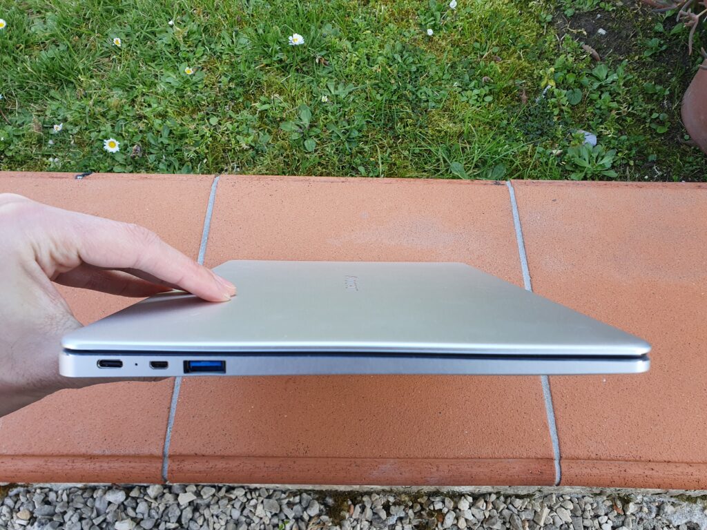 L’aspetto esteriore è bello ed elegante. Devo dire che, prendendolo in mano, sembra di utilizzare un dispositivo premium. Il portatile è solido e robusto, non si piega neanche premendo con forza grazie alla costruzione in lega alluminio-magnesio. La cerniera dello schermo invece non è particolarmente solida: scuotendo il portatile lo schermo si abbassa facilmente. Anche il bilanciamento dei pesi non è ottimale: non si riesce ad aprire il portatile con una mano. Il fondo della macchina è attraversato da due elementi in silicone che consentono un ottima stabilità sul tavolo. Il device non si muove di un millimetro durante la digitazione. L’accesso alla componentistica interna è permesso, a patto di svitare le 12 viti presenti sul fondo del dispositivo. Il pannello inferiore si svita e si smonta con grande facilità consentendo di fare interventi di manutenzione ed upgrade. In realtà tutti i componenti sono saldati, ad eccezione dell’SSD, quindi le possibilità di upgrade sono estremamente limitate.