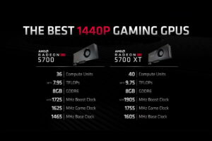 Le differenze tra le due schede video è riassunta nell’infografica qui sopra. Vediamole un po’ più nel dettaglio. RX 5700 ha 36 Compute Unit attive, per un totale di 2304 stream processor con una potenza di calcolo pari a 7,95 TFLOPs. Ritroviamo nuovamente 8 GB di memoria GDDR6, mentre le frequenze operative sono le seguenti: 1465 MHz di base, 1625 MHz in Game e 1725 MHz in Boost. Il TBP è pari a 180 watt. RX 5700 XT è dotata di 40 Compute Unit, per un totale di 2560 stream processor (64 x 40) e una potenza di calcolo fino a 9,75 TFlops con operazioni FP32. Vi sono poi 8 GB di memoria GDDR6 e frequenze della GPU superiori: 1605 MHz di base, 1755 MHz in Game e 1905 MHz in Boost. Il TBP di questa scheda è di 225 watt.