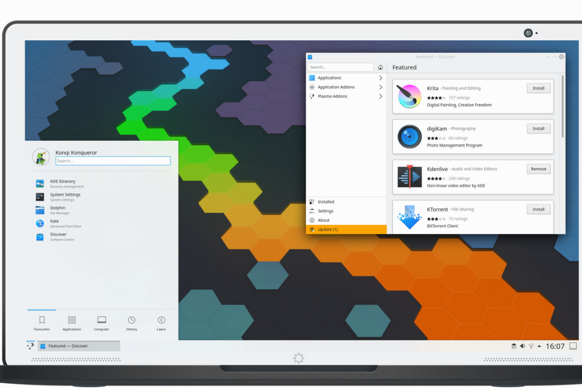 Il Windows Manager KWin va a ridurre il flickering in molte applicazioni. Le icone nelle barre del titolo sono ora colorate per adattarsi alla combinazione di colori e non sono più difficili da vedere. Discover può vantare una migliore consistenza ed usabilità: è più semplice rimuovere i repositories Flatpak e viene mostrata la versione dell’applicazione.