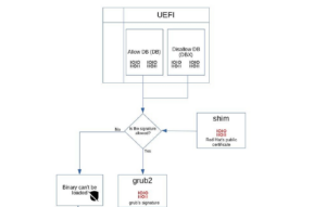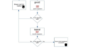 Nell’algoritmo riportato nell’immagine, tra l’altro, si nota che nel processo decisorio sulla firma dei pacchetti rientra anche un altro programma, denominato Shim. Questa applicazione contiene i certificati propri di Debian ed un database di chiavi ed hash considerati sicuri. Questi dati vengono utilizzati per verificare la firma del bootloader stesso, in maniera tale da assicurarsi che non sia stato compromesso. Una volta che GRUB 2 è stato correttamente caricato, poi, si passa alla verifica della firma relativa al Kernel.