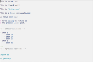 La realizzazione delle slide, da riprodurre grazie a Present, è davvero semplice. Tramite il vostro editor preferito, come Vim, basterà creare un file, ad esempio prova.md, in cui formattare il testo secondo la sintassi markdown. Ogni slide deve essere separata con un trattino ripetuto tre volte, ed è possibile inserire anche immagini e blocchi di codice. Per avere un’idea di come vanno strutturati i file, vi rimando a questa pagina di esempio.