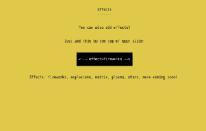 Interessante la possibilità che offre Present di inserire effetti speciali durante le presentazioni, di personalizzare i colori di sfondo e del testo, e di riprodurre su ogni slide dei blocchi di codice registrati con codio.