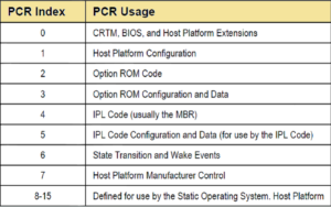 Il TPM, quindi, ha diversi registri denominati registri di configurazione della piattaforma o PCR. Ogni slot ha uno scopo diverso: ad esempio, PCR0 contiene la misurazione del BIOS e di altri componenti, PCR2 contiene eventuali ROM opzionali, e così via. Per una mappatura completa, fate riferimento all’immagine seguente.