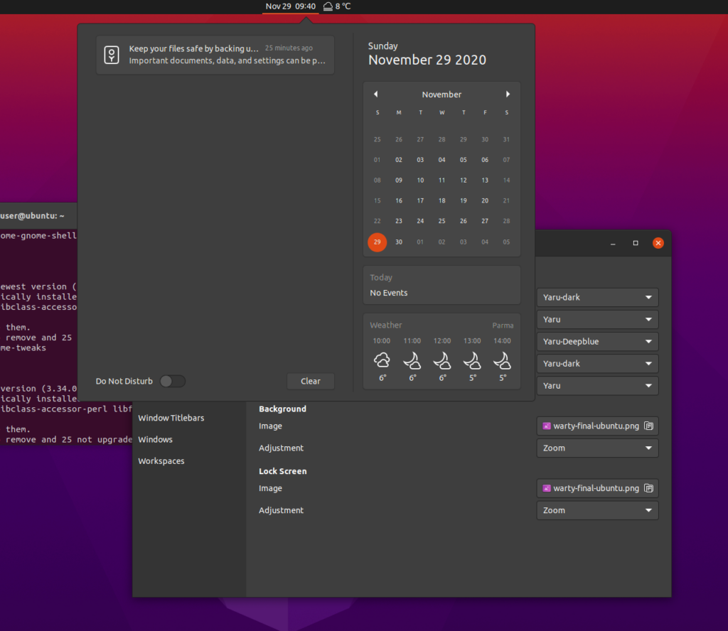 Non tutte, ma la maggioranza delle applicazioni che utilizzano GTK3 si adattano automaticamente al tema scuro. Mozilla Firefox, LibreOffice e tantissime altre app, compreso il terminale, diventeranno Dark. Molte parti di Ubuntu restano però in versione light. Mi riferisco, ad esempio, alla message tray, alla system tray ed anche al calendario.