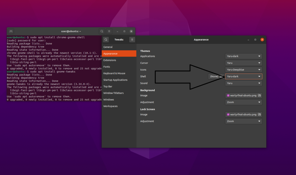 sudo apt install gnome-tweaksTerminata l’installazione aprite Tweaks e nella sezione Appearance > Shell selezionate Yaru Dark.