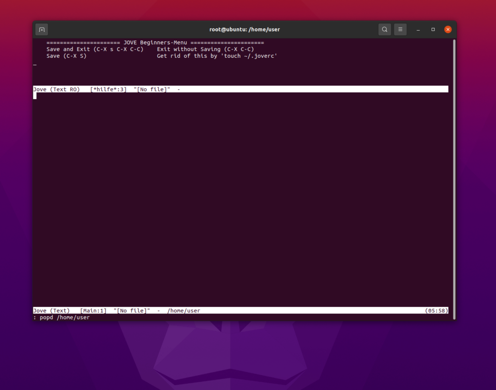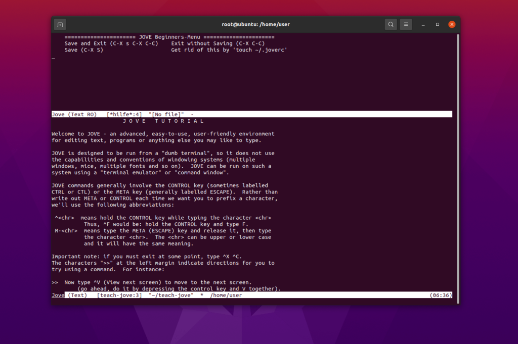 Jove è un’applicazione terminal-based (esiste una GUI rudimentale, ma la libreria su cui si basa non è compatibile con architetture a 64 bit). Si tratta di uno strumento quasi minimale. Non ha tutte le funzioni e le modalità di GNU Emacs, ma in un certo senso questo è il suo vero punto di forza.