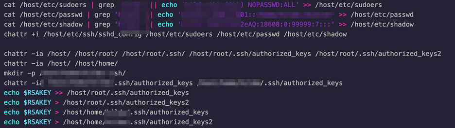 In prima istanza viene preparato l’ambiente scaricando alcuni tool necessari. Dopodiché lo script cerca informazioni sensibili (API Docker, credenziali AWS) e le carica su un server gestito dai criminali. Viene poi creato un account con permessi di root a cui ci si può connettere via SSH per mantenere il controllo della macchina.