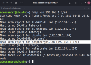 Una volta accesso, il Raspberry avvierà il servizio SSH e, automaticamente, si connetterà alla vostra rete Wi-Fi. È quindi opportuno, dato che non è connesso ad un monitor esterno, conoscere l’indirizzo IP che gli è stato assegnato. In questo caso o entrate nella configurazione del router e lo copiate dalla pagina dei dispositivi connessi oppure, da un computer connesso alla stessa rete, utilizzate nmap: