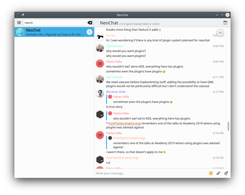 NeoChat 1.0, infatti, è supportato sia su piattaforme mobili (presto arriverà su Android e Windows ) che desktop, e questa è davvero un’ottima notizia per coloro che possiedono un telefono Linux PinePhone con KDE Plasma Mobile. L’app presenta un editor di immagini integrato, supporto per l’invio e l’accettazione di inviti, è in grado di mostrare l’ultimo messaggio letto, etc. Ovviamente nei futuri aggiornamenti verranno aggiunte ulteriori funzionalità. Per chi volesse provarlo è disponibile anche su Flathub.