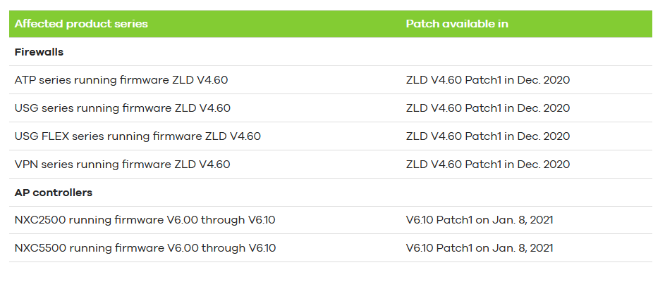 Attualmente sono state rilasciate patch per le serie ATP, USG, USG Flex e VPN. Le patch per la serie NXC sono previste per l’8 gennaio come comunicato dall’azienda.