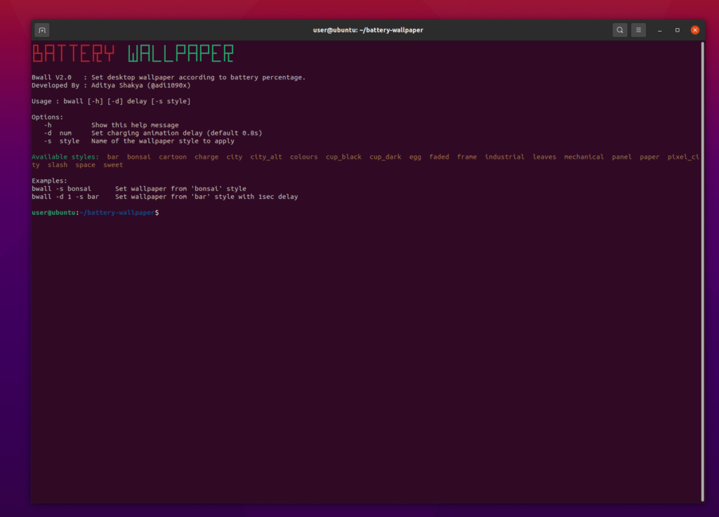 Oltre a consentire all’utente di scegliere lo sfondo, Bwall ha anche un’opzione per impostare il ritardo dell’animazione (-d num), che è impostato, di default, a 0.8 secondi. Sono necessarie alcune dipendenze: acpi per lo stato della batteria e feh per impostare il wallpaper come sfondo del desktop. Ecco il wallpaper in azione mentre state caricando la batteria: