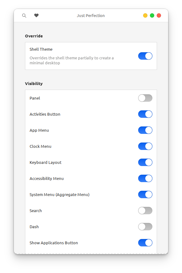 Come dice il nome, siamo vicini alla perfezione. L’estensione Just Perfection fa un sacco di cose, e le fa in modo semplice ed intuitivo. Ad esempio, permette di nascondere la dash nel caso in cui si desideri utilizzare una dock di terze parti, oppure si può semplicemente spostare il top panel verso il basso ma anche disabilitarlo completamente per gli amanti del pulito. Consente di disabilitare molti elementi che potreste non volere sul vostro pannello, ecco l’elenco completo riportato dai dev: