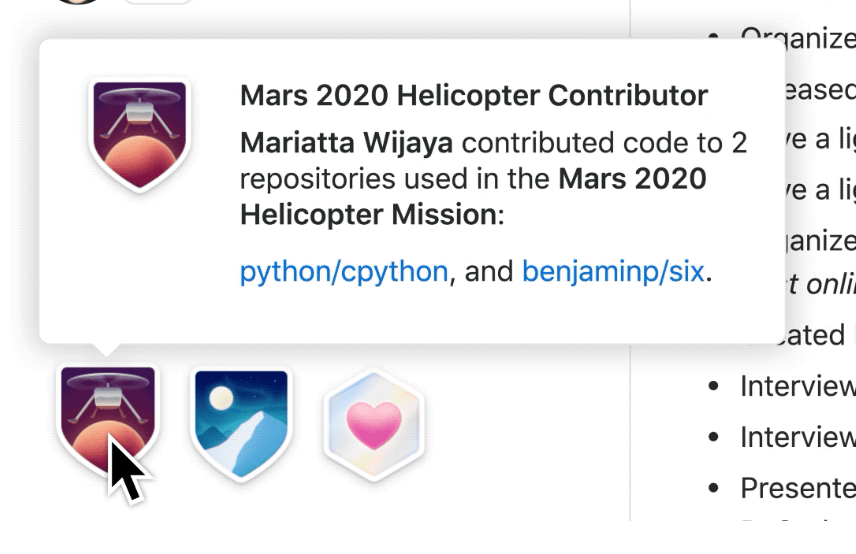 Come il badge Arctic Code Vault Contributor appuntato l’anno scorso a milioni di profili GitHub, il nuovo badge onora le persone che hanno aiutato l’umanità a fare un passo avanti.