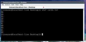 Il comando shuf genera permutazioni casuali delle righe di input. Se viene fornito un file o una serie di file come argomento, mescolerà le righe e scriverà il risultato sullo standard output. Può anche limitare il numero di risultati restituiti, supporta la selezione di righe casuali da un file o dati da un elenco. Nell’esempio seguente ho salvato in un file testuale cards.txt un elenco di carte, ordinate per seme e numero. Potete visionare l’output nello screenshot.