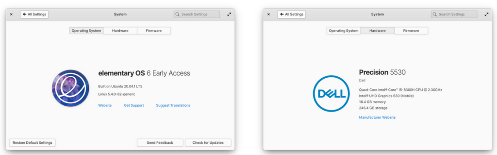 Il firmware aggiornabile, in particolare utilizzando LVFS e fwupd, è una funzionalità emergente tra i rivenditori OEM. Gli sviluppatori hanno lavorato per aggiungere questa funzionalità direttamente nelle Impostazioni di sistema. In generale tutta l’area Impostazioni di sistema → Sistema è stata ridisegnata. La scheda Sistema Operativo ha un layout più carino, la scheda Hardware mostra le informazioni più importanti consentendo agli OEM di fornire un logo o un’immagine del prodotto ad alta risoluzione, un marchio specifico del modello e un collegamento al proprio sito web. Migliorato anche il rilevamento e la visualizzazione di GPU e processori ARM.