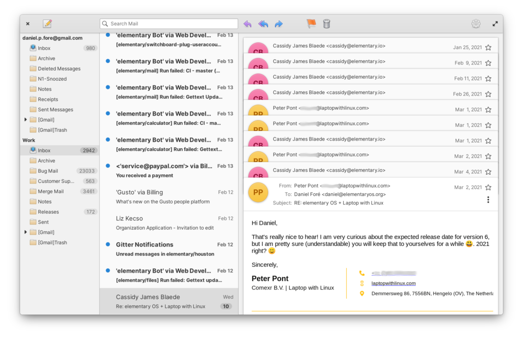 L’app Mail è stata completamente riscritta, invece di fare affidamento sul backend di Geary (a proposito, è da poco disponibile Geary 40!), ora utilizza Evolution Data Server. Tasks è un’app tutta nuova che dialoga anche con Evolution Data Server, consentendo di vedere e sincronizzare le cose da fare con vari servizi. Attualmente, la configurazione di un account richiede l’installazione di Evolution dai repository di Ubuntu (sudo apt install evolution) e la configurazione dell’account.