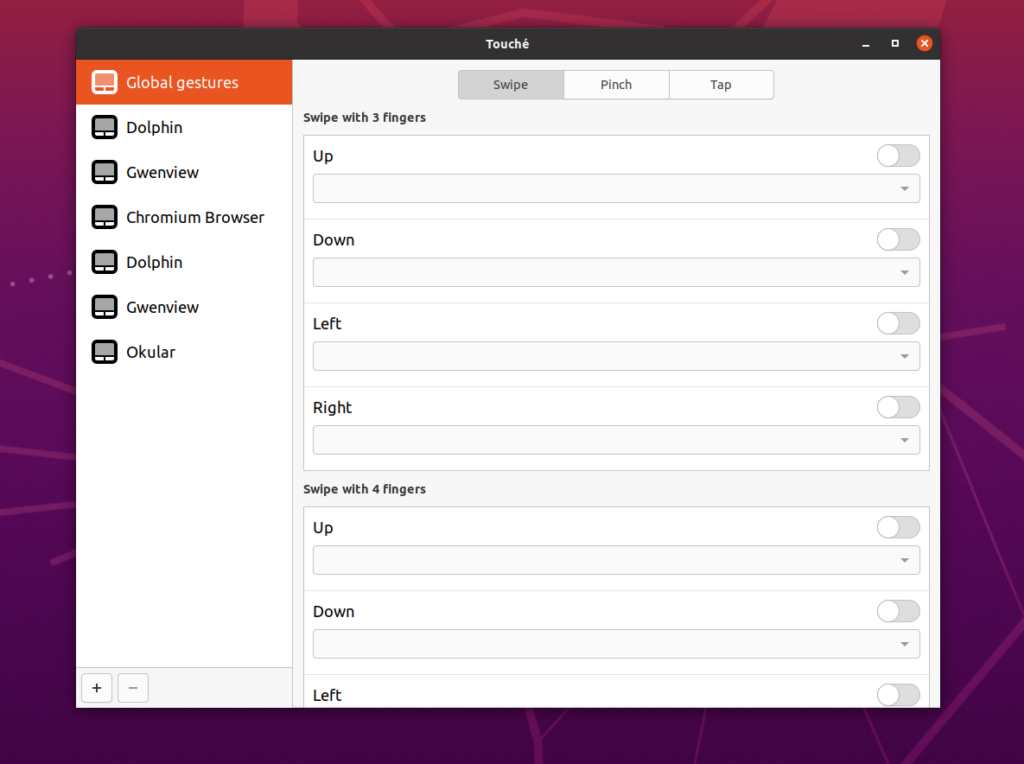 Poiché Ubuntu non offre un’utility per configurare le funzioni multi-touch, possiamo ricorrere a uno strumento open-source quale touchegg. Questo tool supporta sia i gesti globali che i quelli dedicati ad app quali, Chromium, Dolphin, etc.