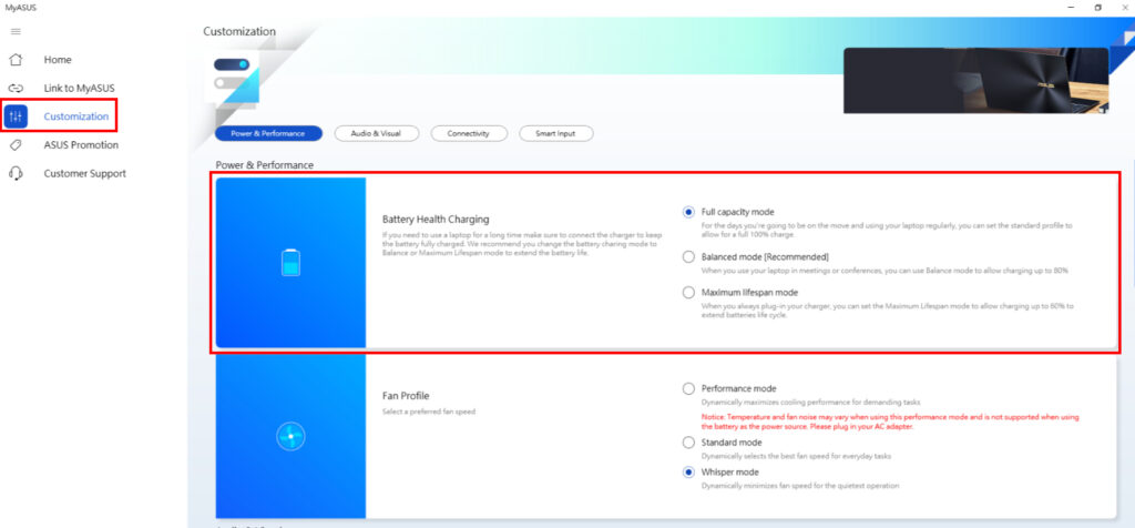 - Maximum lifespan mode: il laptop viene ricaricato all’80%
