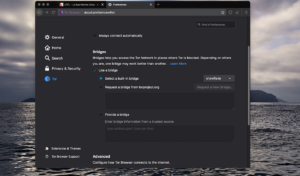 Per abilitare Snowflake come bridge per la connessione alla rete Tor dovete visitare la sezione Tor nelle Preferenze. Abilitate quindi l’opzione use a bridge, e poi Snowflake dall’opzione select a built-in bridge. Snowflake è disponibile per tutte le piattaforme supportate dal browser, incluso GNU/Linux, ovviamente.