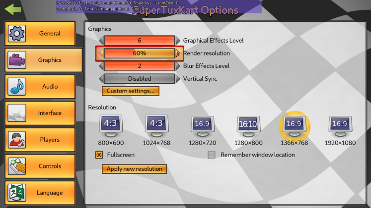 Presenti anche migliorie dal punto di vista della grafica. Grazie ad un apposito slider nella sezione Graphics è ora possibile modificare la risoluzione fino al 50%, in modo da migliorare il frame rate su macchine poco performanti.
