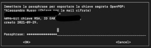 Lo step successivo consiste nel caricare la chiave pubblica sul server. Lanciate il comando gpg –list-key [Vostra_Mail], copiate l’ID che vi verrà mostrato sotto la voce “pub” e, successivamente, inseritelo nella seguente istruzione senza parentesi quadre: gpg –send-key [ID]. In caso di problemi di caricamento della chiave, utilizzate alternativamente la seguente istruzione: gpg –keyserver keyserver.ubuntu.com –send-key [ID]. Conviene, a questo punto, esportare in file locali sia la chiave pubblica che quella privata. Vi prego di non essere ingenui e, per quanto riguarda la seconda, non conservarla assolutamente nel cloud:
