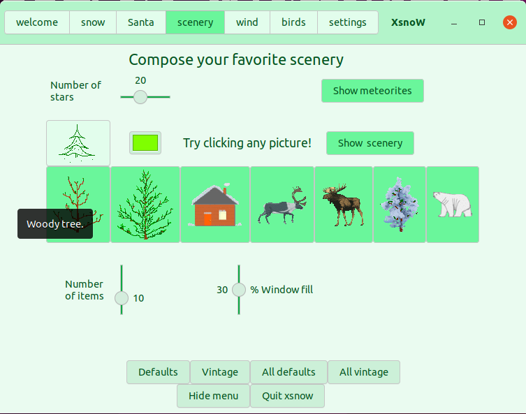 xSnow è leggermente diverso dall’estensione GNOME perché non è solo un effetto di sovrapposizione ma un’intera suite di animazioni con una miriade di impostazioni che potete modificare a vostro piacimento.