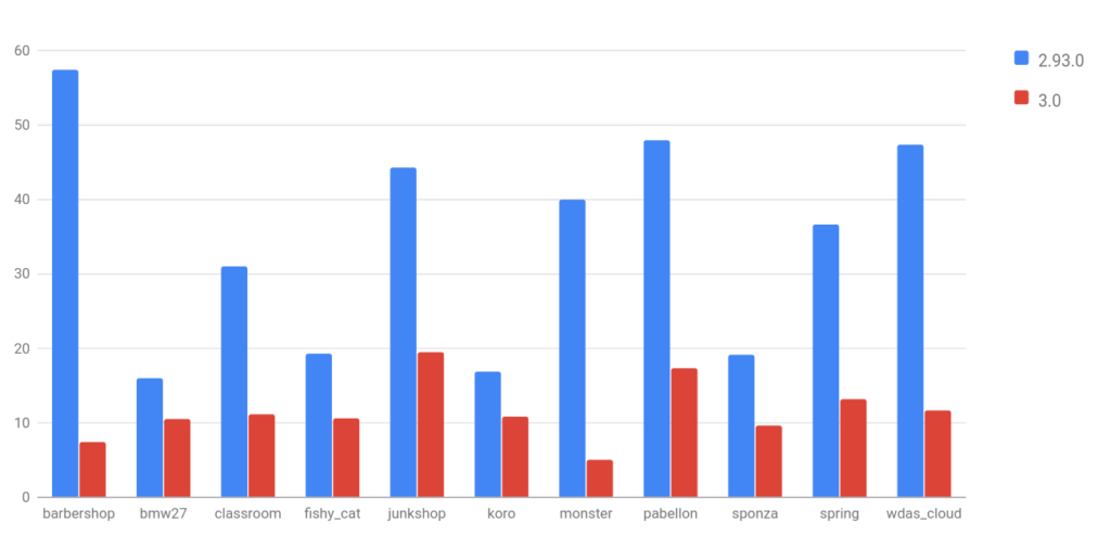 Per dimostrare la bontà del loro lavoro hanno pubblicato un test in cui una NVIDIA Quadro RTX A6000, con OptiX è stata provata sia con la versione 2.93 che la nuova 3.0. Come si può evincere dal grafico sotto riportato, il miglioramento prestazionale va dalle 3 alle 5 volte (!).