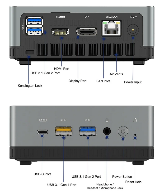 | Ports | 1 * RJ45 2.5 Gigabit Ethernet Port 1 * USB3.0 Port×1(Gen1 , 2.0A Max output , shutdown charging , Yellow) 3 * SB3.1 Port(Gen2 , Blue) 1 * USB-C Port(Gen2), 1 * HDMI 2.0, 1 * Display Port, 1 * Audio Jack, 1 * Clear CMOS |