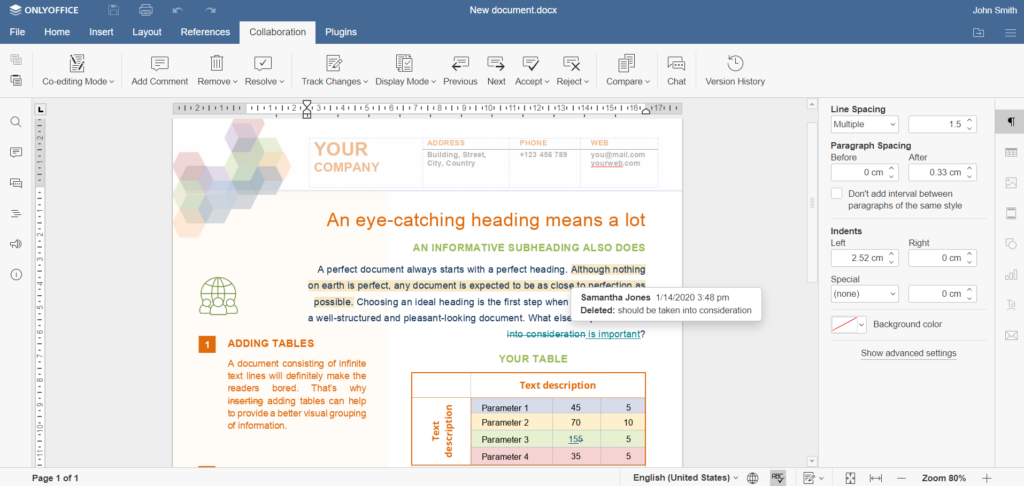 ONLYOFFICE 7.0 consente di scegliere tra due modalità di visualizzazione durante la revisione delle modifiche apportate da altri coautori: