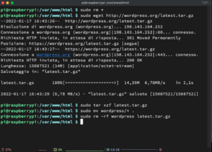 Adesso è tutto pronto per l’installazione di WordPress su Raspberry Pi. Pulite la cartella di destinazione, scaricate la versione più recente del CMS e scompattatene il contenuto nella precedente directory: