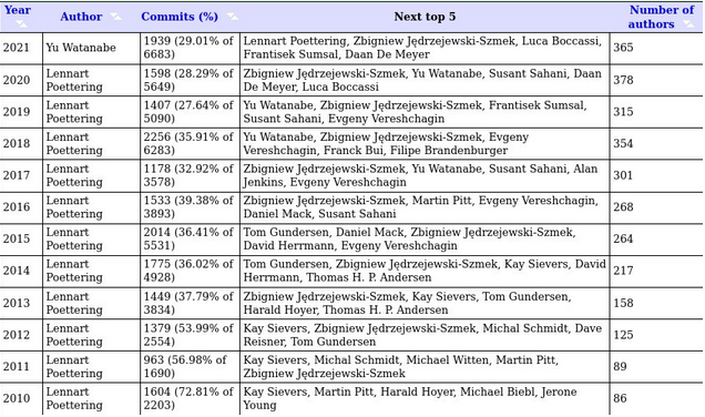 Systemd vanta un pool di caratteristiche e funzionalità in continua crescita. Sorprendentemente, per la prima volta dopo oltre 10 anni, Lennart Poettering non è più la persona col maggior numero di commit. È stato scalzato da Yu Watanabe di Red Hat, che ha registrato 1939 commit su un totale di 6’683 (il 29%). Nel corso della storia di Systemd ci sono stati più di 55k commit operati da circa 2’000 autori diversi: oltre il 12% dei commit è stato eseguito nel 2021!