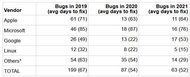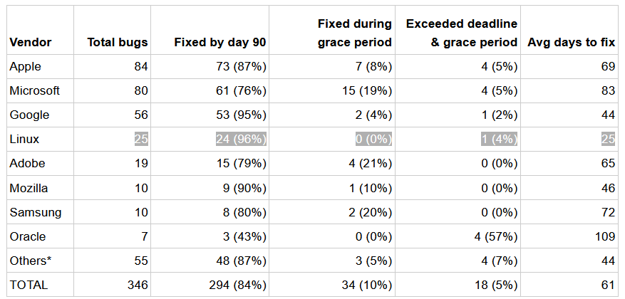 Tra gennaio 2019 e dicembre 2021, Project Zero ha scovato e segnalato 376 bug. Una volta scovata una falla e segnalata all’azienda il team dà 90 giorni di tempo per chiuderla. Ben 351 (dunque il 93,4%) bug su 376 sono stati corretti, 14 (3,7%) sono stati contrassegnati come “WontFix” dai vendor e 11 (2,9%) sono ancora aperti. Tuttavia, tre sono ancora entro il termine di 90 giorni. Nel periodo indicato (2019-2021) l’azienda che ha ricevuto più segnalazioni è stata Apple (84 bug) seguita da Microsoft (80) e da Google (56). Linux è al quarto posto con 25 bug.
