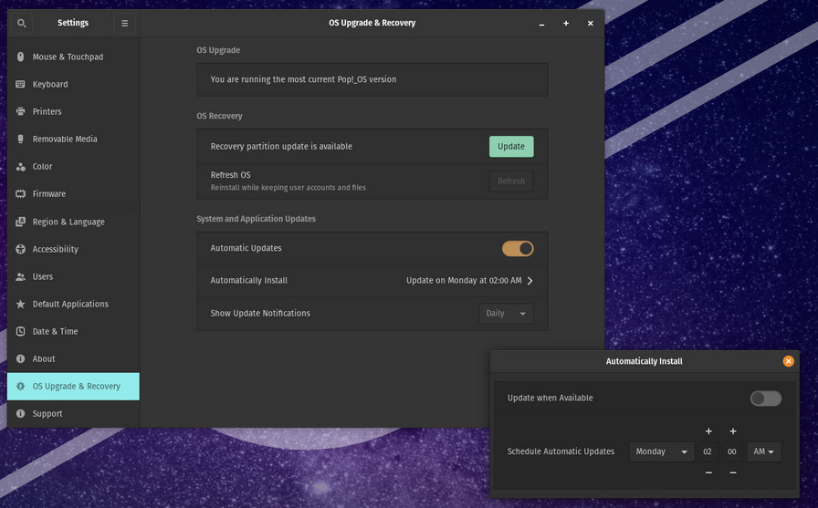 Le nuove opzioni di pianificazione degli aggiornamenti sono ora disponibili nel pannello Impostazioni > Aggiornamento e ripristino del sistema operativo. In questa sezione gli utenti di Pop OS possono stabilire una data e un orario per gestire e programmare gli aggiornamenti (software repository, Flatpak e Nix).
