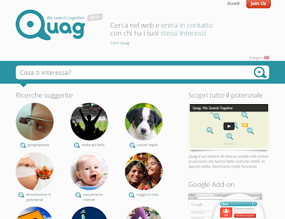 Quag è un nuovo motore di ricerca italiano che aggiunge alcune funzionalità social simili al buon vecchio Volumia permettendo quindi di far interagire gli utenti con interessi comuni o che navigano in alcuni siti.